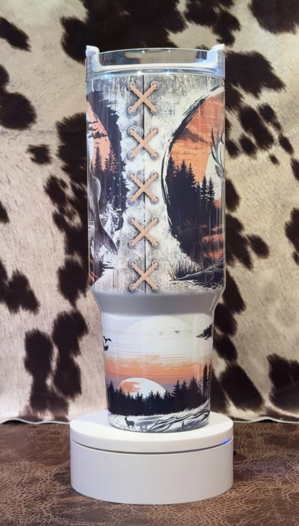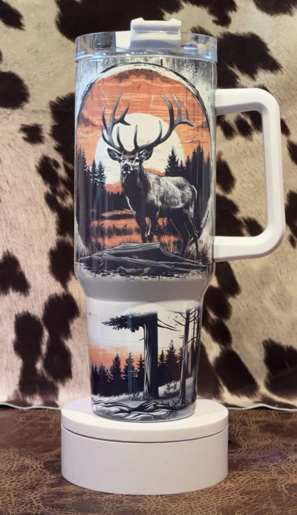 Made for the outdoorsman at heart, this rugged 40 oz handled tumbler features a bold rustic design with fishing, hunting, deer, and scenic woodland sunset artwork that captures the spirit of the outdoors.