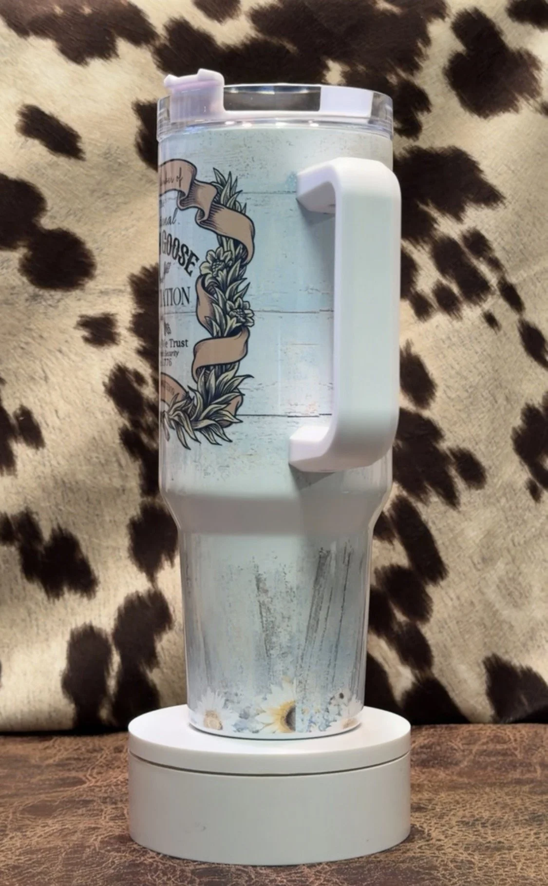 This 40 oz handled tumbler features a beautifully vintage-inspired porch goose design with soft blue tones, rustic wood texture, and an “official society” style emblem that proudly declares your loyalty to the flock.