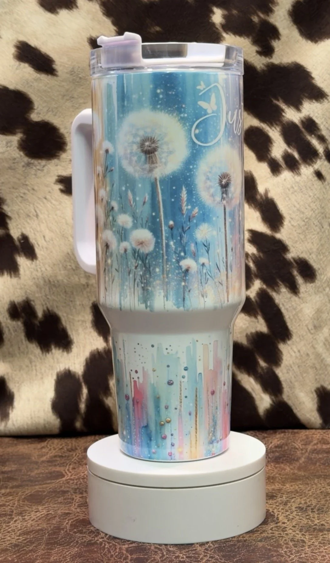 A beautiful reminder to slow down, reset, and take a deep breath. This dreamy 40 oz handled tumbler features a soft pastel design with dandelions, butterflies, sparkling details, and the uplifting phrase “Just Breathe.”
